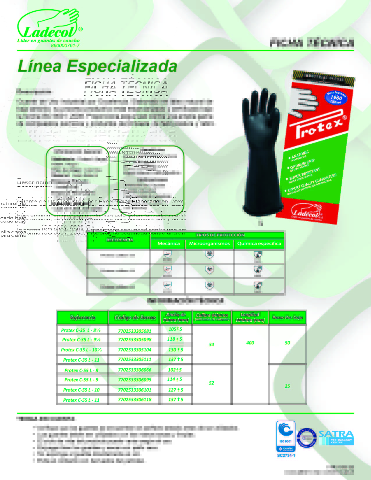 GUANTES DE LÁTEX - PROTEXCalibres: 25, 35, 55, 65Fabricado en CauchoAnatómico, optimo agarreResiste soluciones diluidas ácidos, blanqueadoresTallas: De 7 a 10Para labores de limpieza, construcción, frigoríficos, pesquera, láctea, avicola, minería, agrícola, procesos químicos, petroleras, etc.